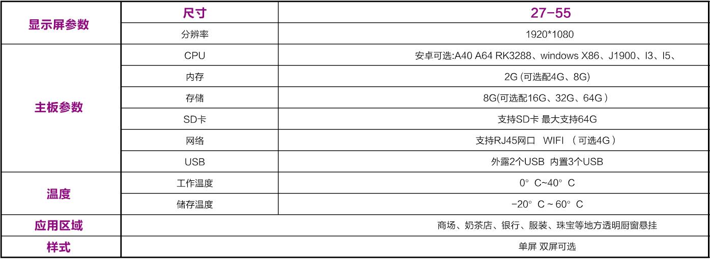 超薄機身;超窄邊框;外觀精美;雙面設計;任意分屏顯示;多窗口視頻圖片播放;高清畫質;散熱快、流暢運行;是商業宣傳的不二之選。